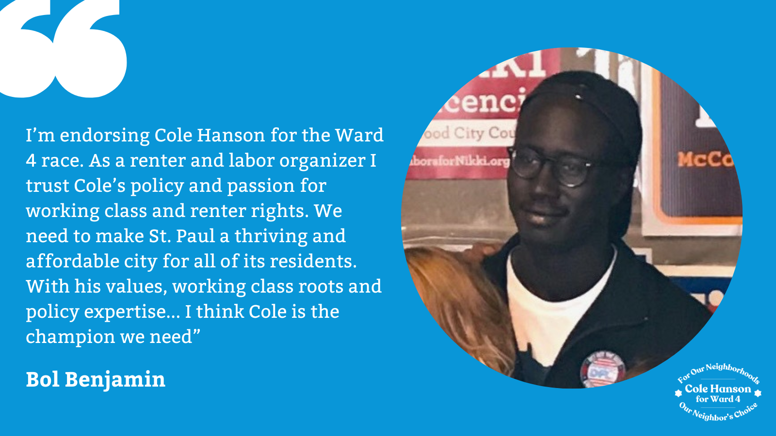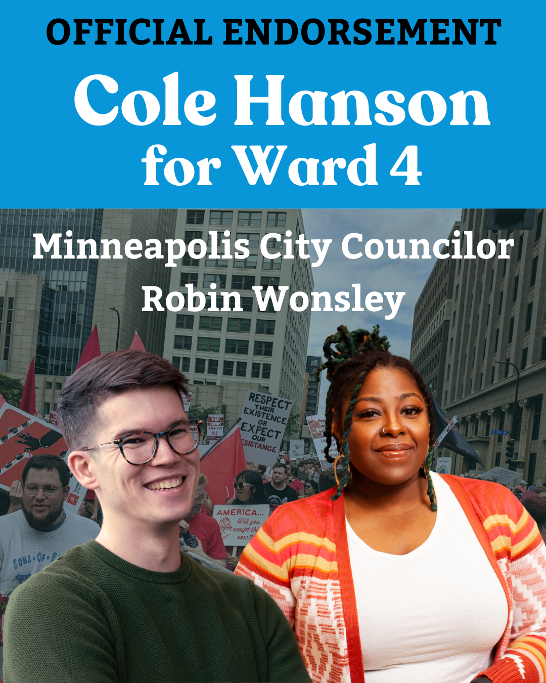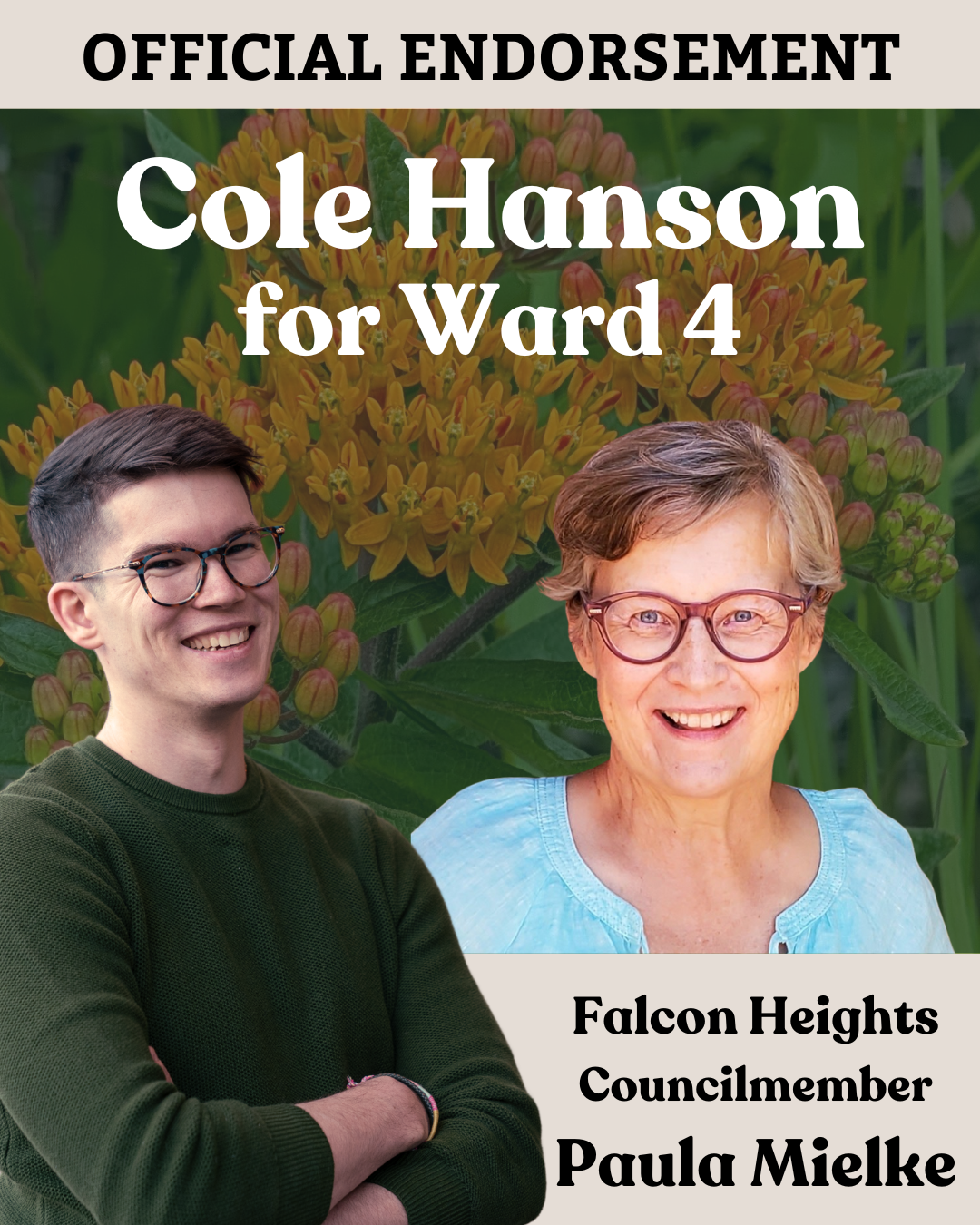 “I’m proud to endorse Cole Hanson as my #1 choice for St. Paul City Council in Ward 4! Cole is a true people’s candidate — rooted in community, committed to renters and fighting against displacement, and laser-focused on championing the basics: safe streets, responsive services, thriving business corridors, and a city that shows up for working families.